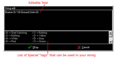 Simple enough. You may be wondering about those tags at the bottom. If you're familiar with hex editing and the trick to change colors of text in a SCM or SCX, then this should be familiar. These are those same hex bytes (ASCII values) that change the color of text, indent, center, or align certain text. To "get them to work" you basically place on of these tags before the text you want to be effected by them and everything after it will be altered by the tag. For example, if you place <7> before "Marine", then Marine will be displayed in a green color in the game. (Some of these values do different things depending on whether the text is displayed actually in the game or in a menu/mission briefing screen) The "Start Substring" special character (which is only used for unit names at the top) is mainly used on unit names to organize where they go in Staredit (the substring is not actually displayed). For example, the Marine is normally in the "Ground Units" section of Staredit Terran units. Substrings don't really have any effect in the game. Another thing you might notice in a couple lines is a single character (letter) in front of an otherwise recognizable string. For example: t<4>Research